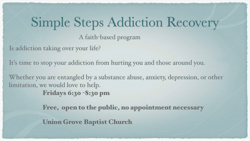 No matter what is going on in your life, no matter what you are struggling with, Simple Steps is for you. This is an “open” program. Loved ones, spouses, and parents are encouraged to attend the program with or without those that struggle with an addiction.